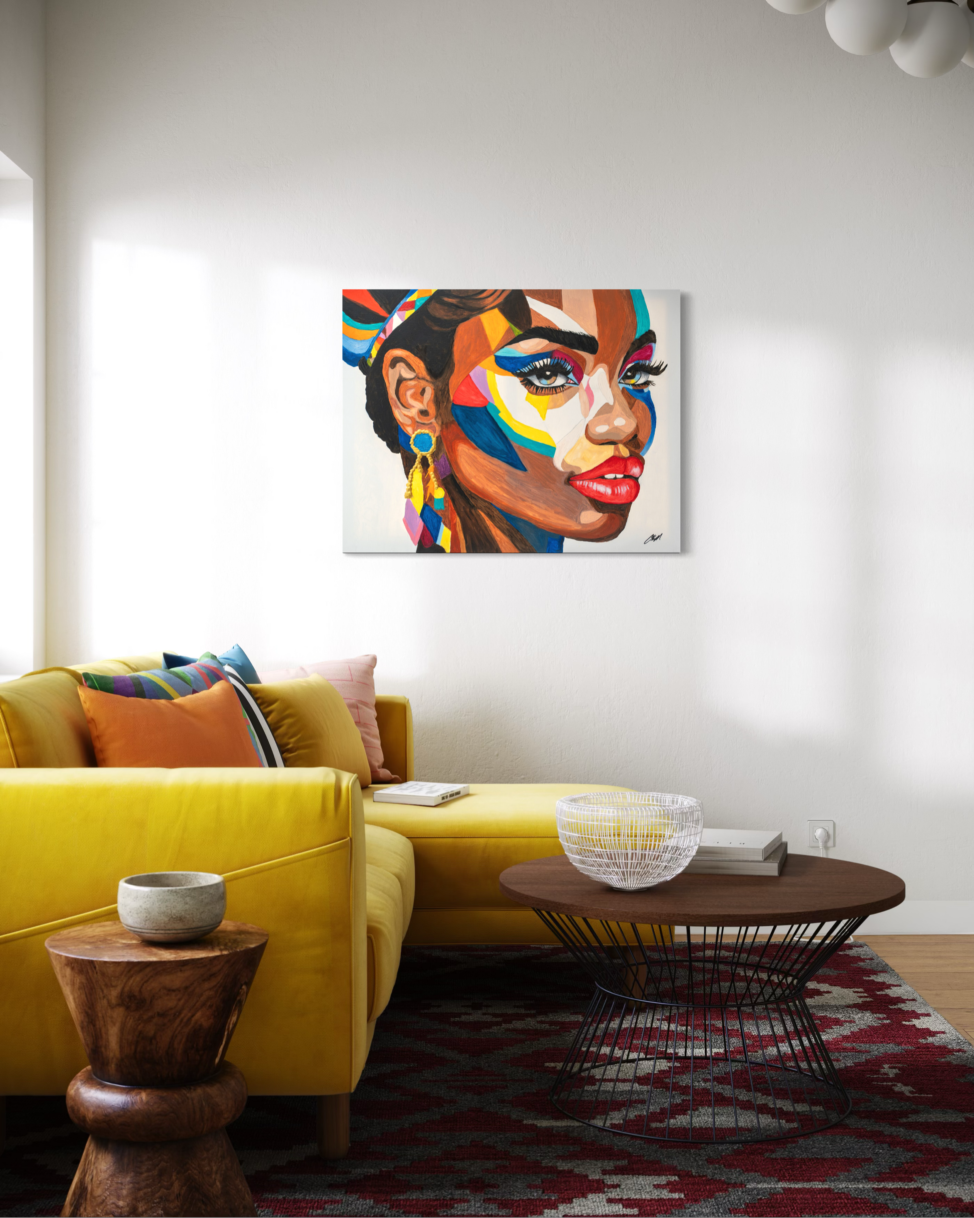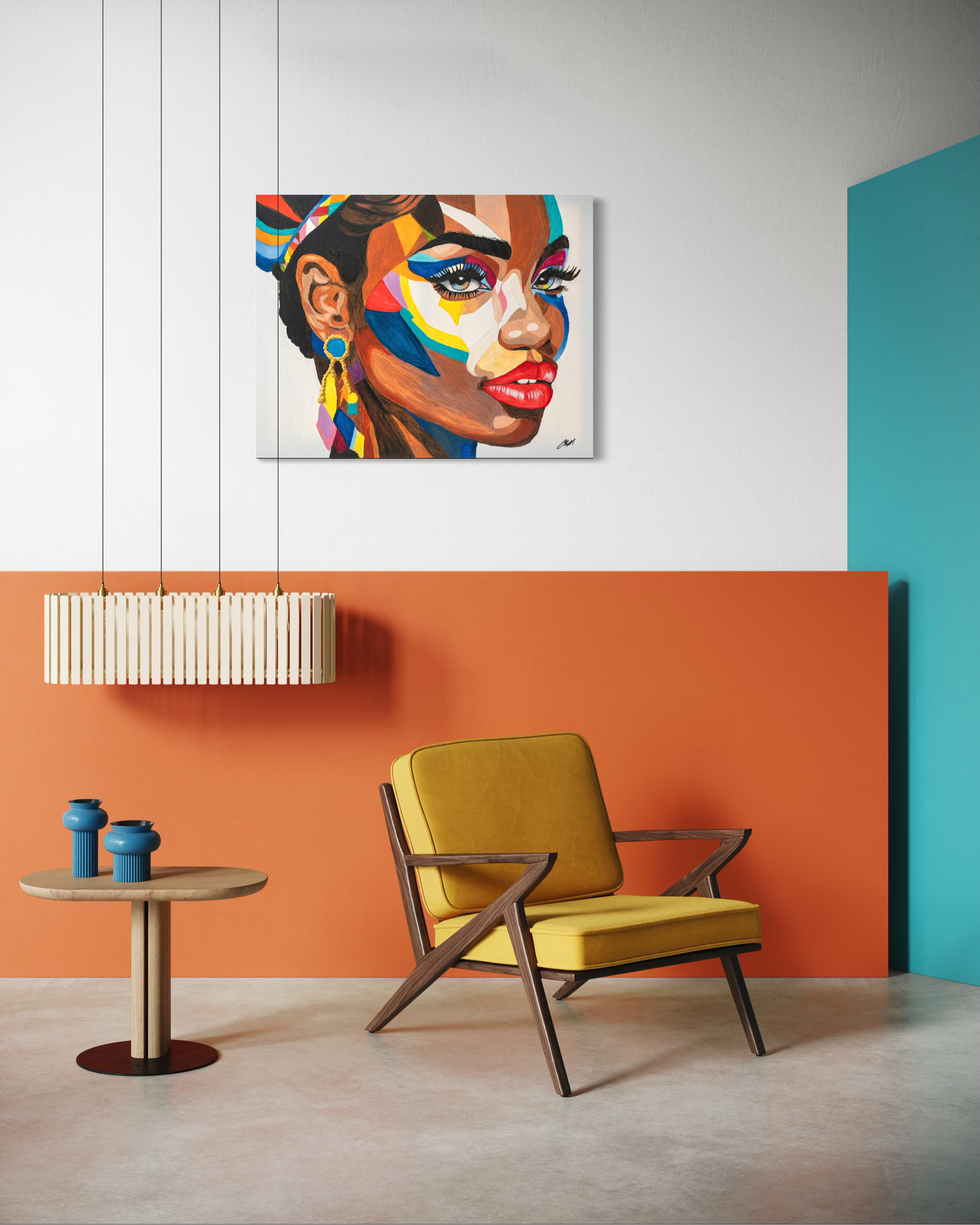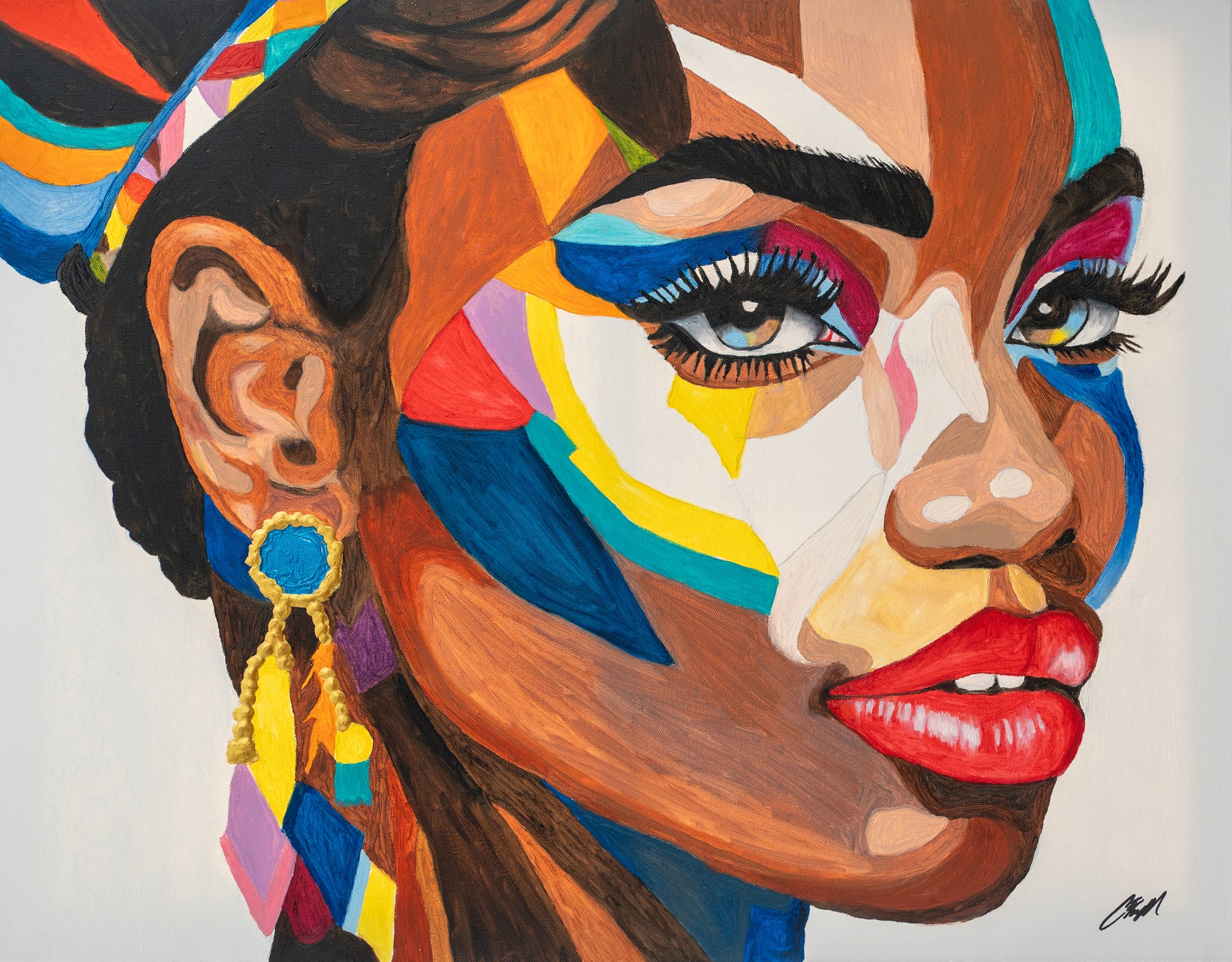 A vibrant collage of colors forming a striking portrait, blending modern art with expressive emotion.